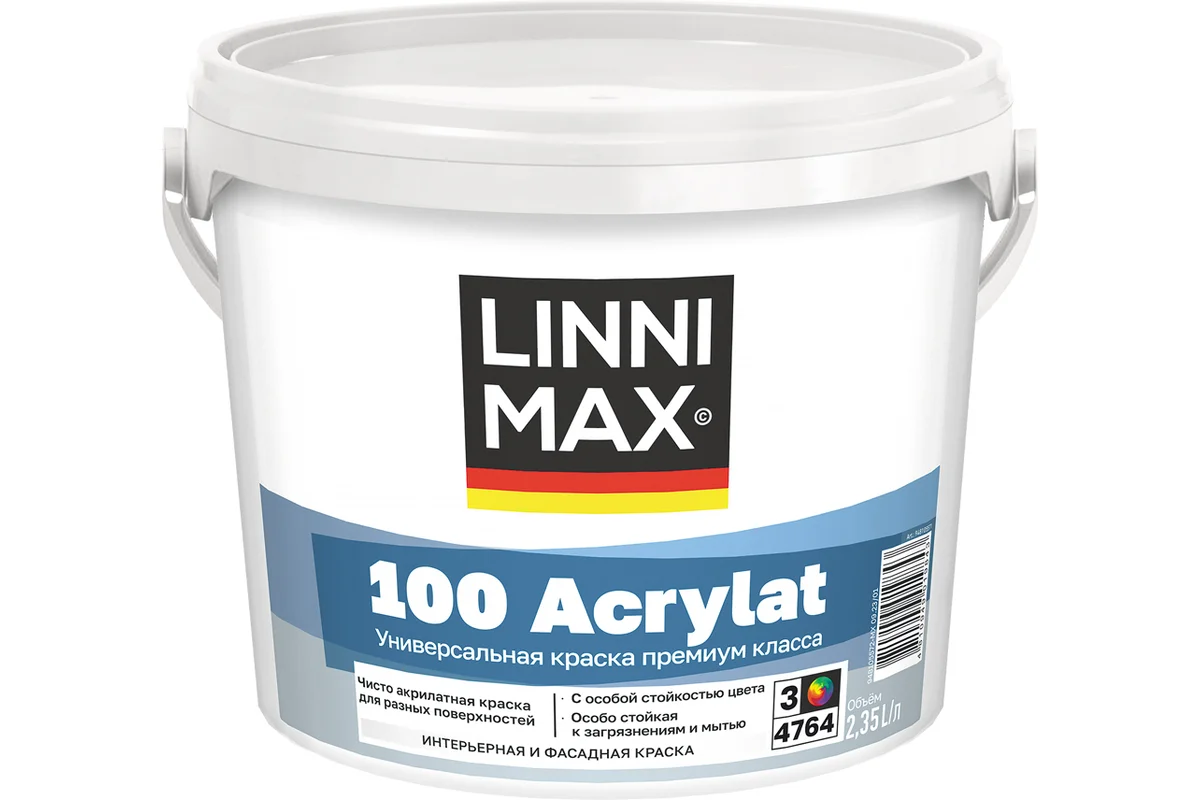 100 ACRYLAT – это уникальная чисто акрилатная краска, предназначенная для внутренних и наружных работ. Как фасадная и интерьерная краска нового поколения, она обеспечивает высокую адгезию к различным поверхностям, не содержит растворителей и вредных добавок.Область применения: